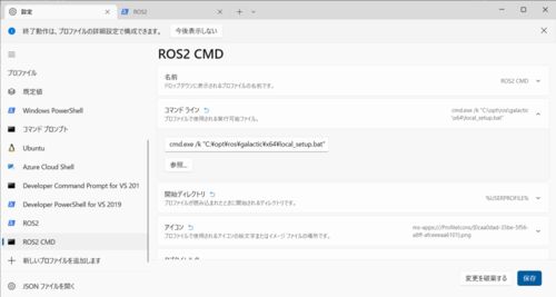 まとめ 事例:ROS2でターミナル起動毎に実行する内容 補足: ROS2のインストール形式 Windows Terminalを用いた解決策 新しいターミナルの登録手順 コマンドプロンプトを用いる時の設定 Powershellを用いるときの設定 補足:複数のコマンドを実行したい場合 …